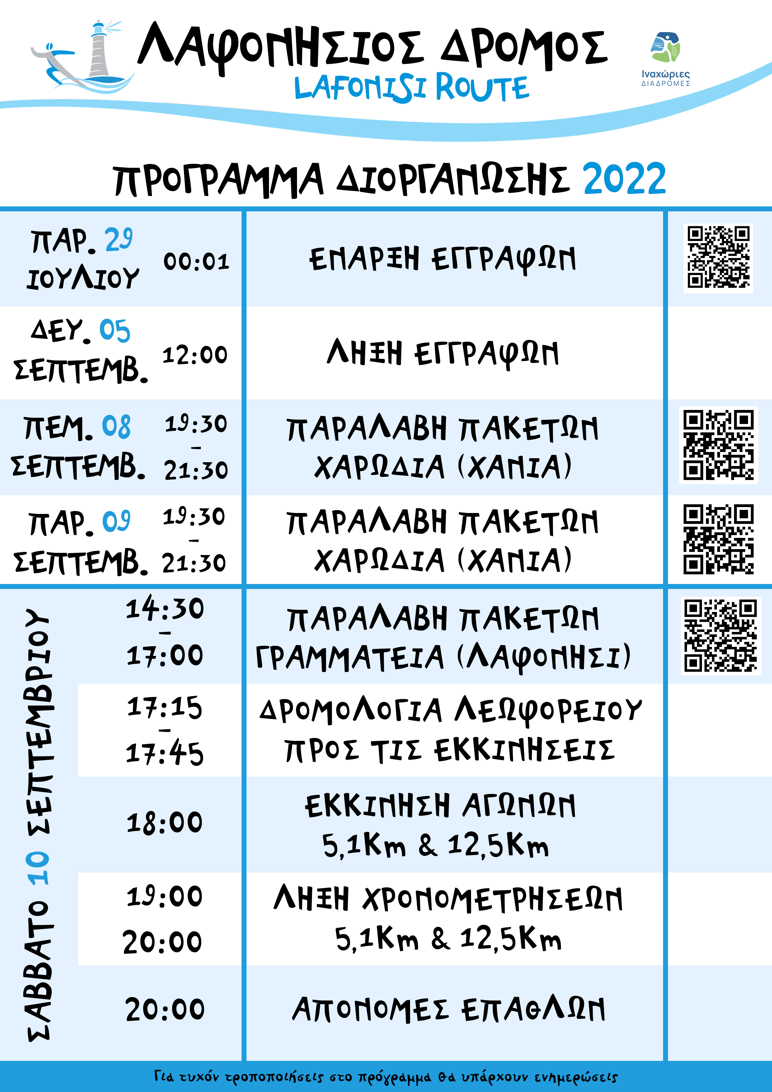 Εναλλακτικά θα μπορεί να γίνει παραλαβή πακέτων και την ημέρα διεξαγωγής του αγώνα το ΣΑΒΒΑΤΟ 10 ΣΕΠΤΕΜΒΡΙΟΥ 2022 και ώρες 14:30 με 17:00 στην Γραμματεία όπου θα υπάρχει στο ΛΑΦΟΝΗΣΙ – ΜΙΝΙ ΜΑΡΚΕΤ ΣΧΟΙΝΟΠΛΟΚΑΚΗΣ 700Μ πριν την παραλία https://bit.ly/lafonisios-grammateia , σημείο απ’όπου θα αποχωρήσει και το λεωφορείο της διοργάνωσης για τις εκκινήσεις των αγώνων.