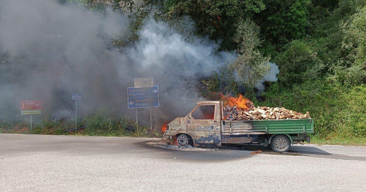 Πυρκαγιά ξέσπασε σε φορτηγάκι, το οποίο μετέφερε ξύλα, στην περιοχή των Βουβών του Δήμου Πλατανιά λίγο πριν τη 1 το μεσημέρι.