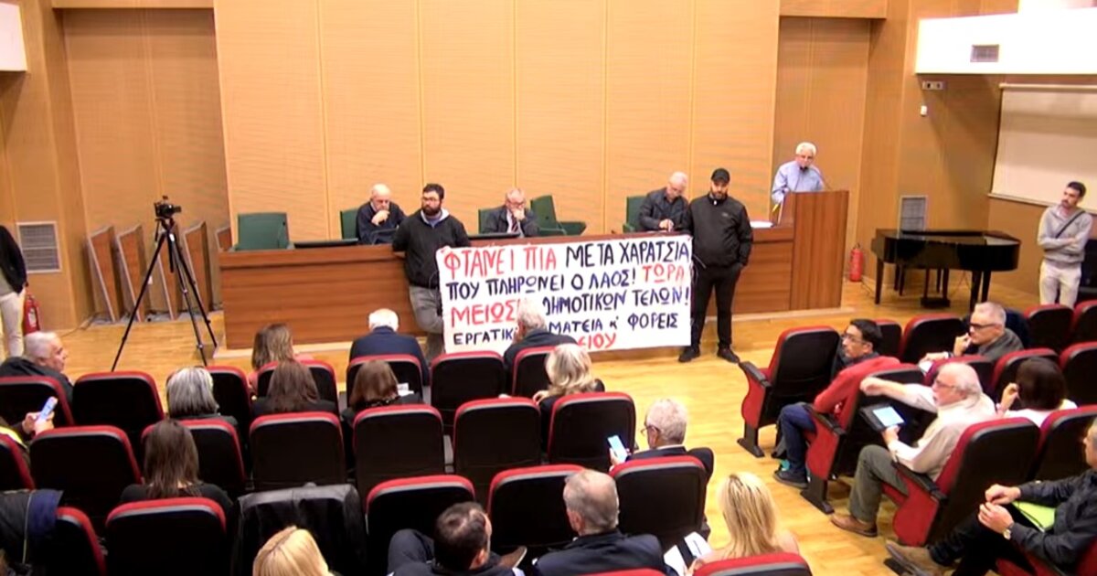 Η συνεδρίαση σε αίθουσα της Βικελαίας Δημοτικής Βιβλιοθήκης, ξεκίνησε με παράσταση διαμαρτυρίας, από εκπροσώπους εργατικών σωματείων και φορέων, που ανήρτησαν πανό με το οποίο ζητούν μείωση των δημοτικών τελών.
