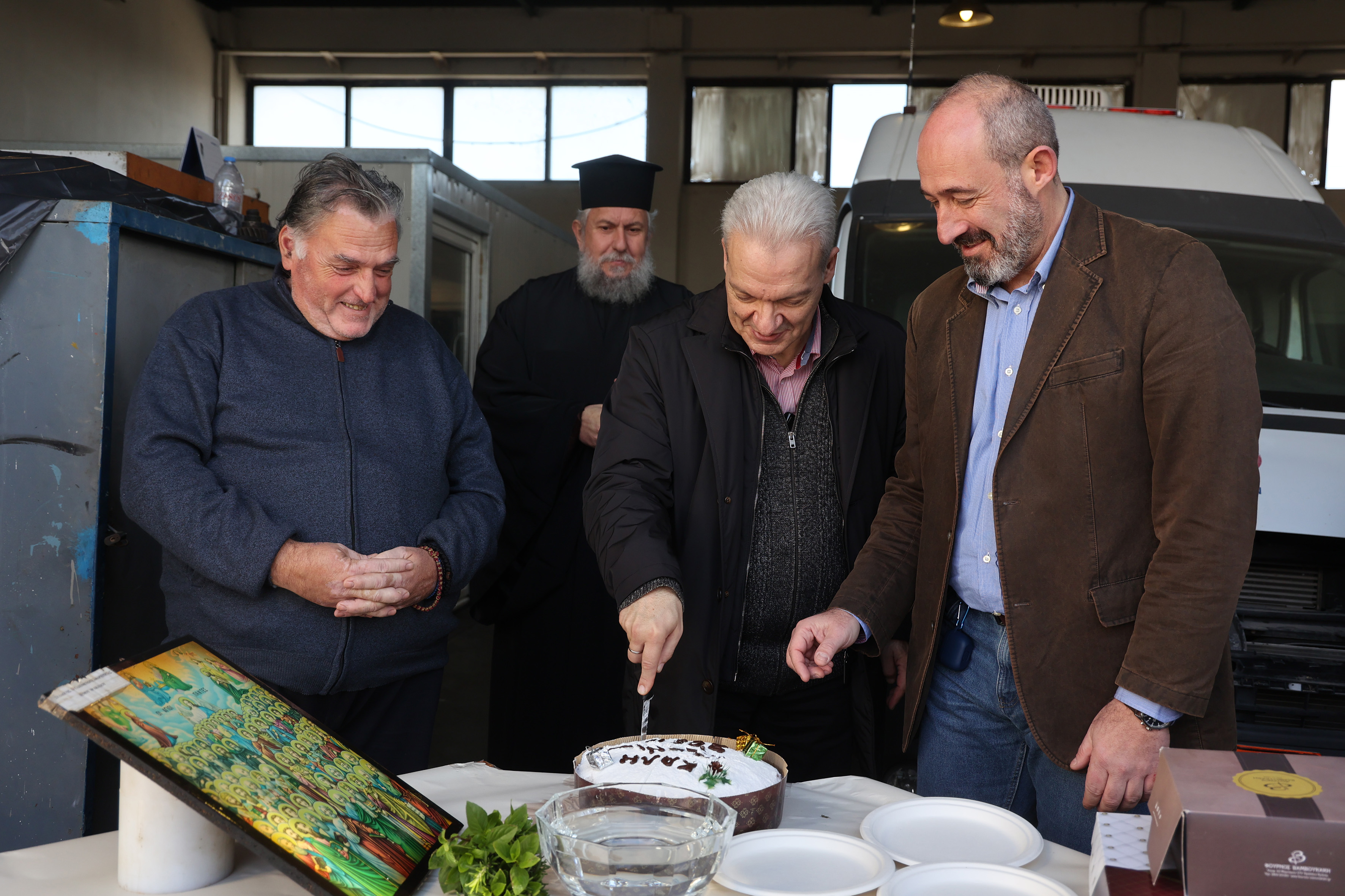 Ο Δήμαρχος Αλέξης Καλοκαιρινός, τέλος, παρέστη και στην τελετή κοπής της Πρωτοχρονιάτικης πίτας των συνεργείων οχημάτων του Δήμου, ανταλλάσσοντας ευχές με τους εργαζόμενους για καλή χρονιά, υγεία και δύναμη για την εκπλήρωση των καθηκόντων τους.