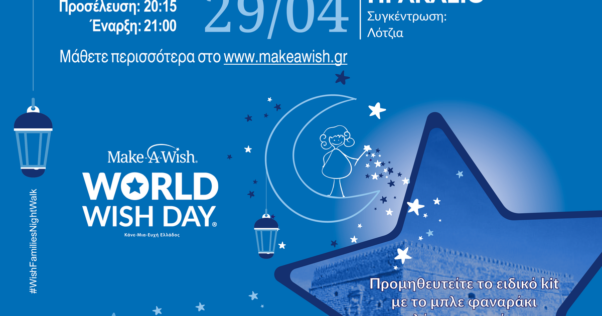 Το Make-A-Wish (Κάνε-Μια-Ευχή Ελλάδος) ανήμερα της 29ης Απριλίου, με ώρα συγκέντρωσης 20:15, διοργανώνει τον καθιερωμένο ετήσιο περίπατο, Walk for Wishes 2024, σε Αθήνα, Θεσσαλονίκη... και όχι μόνο! Φέτος, με πρωτοβουλία οικογενειών παιδιών ευχής ο περίπατος θα διεξαχθεί και σε άλλες πόλεις ανά την Ελλάδα και ανάμεσα σε αυτές είναι και η πόλη μας, το Ηράκλειο! Oι περίπατοι θα είναι βραδινοί ώστε να φωτίσουμε τον ελληνικό ουρανό, από άκρη σε άκρη, στο μπλε χρώμα του Make-A-Wish με ειδικά φαναράκια και φωταγωγήσεις, ενώ τις πορείες θα οδηγήσουν παιδιά ευχής και οι οικογένειές τους. Με τους συμβολικούς αυτούς περίπατους θα τιμήσουμε τα παιδιά ευχής που πάλεψαν με μία σοβαρή ασθένεια και έγιναν καλά, ή που εξακολουθούν να παλεύουν, αλλά και τη μνήμη εκείνων που φώτισαν το δρόμο μας.