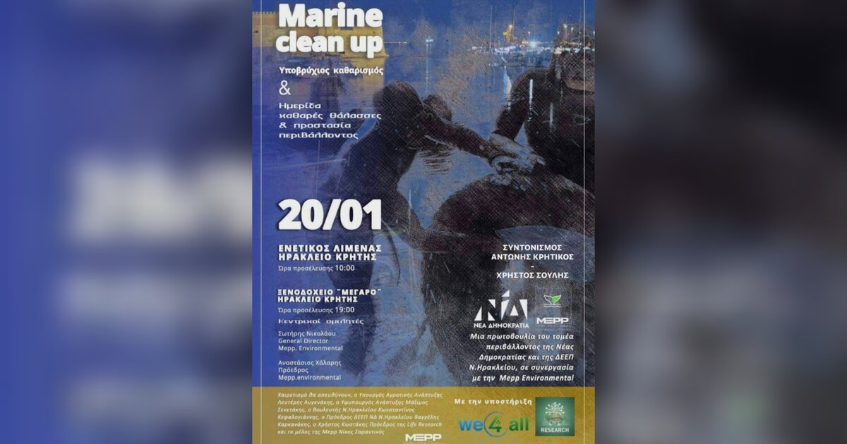 Εκδήλωση για το περιβάλλον, για ένα πιο βιώσιμο μέλλον, όπως τονίζεται, διοργανώνει η Διοικούσα Επιτροπή Ηρακλείου Νέας Δημοκρατίας, το Σάββατο 20 Ιανουαρίου στις 10.00 το πρωί για τον υποβρύχιο καθαρισμό στο λιμάνι του Ηρακλείου, σε στενή συνεργασία με τον Τομέα Περιβάλλοντος της Νέας Δημοκρατίας.