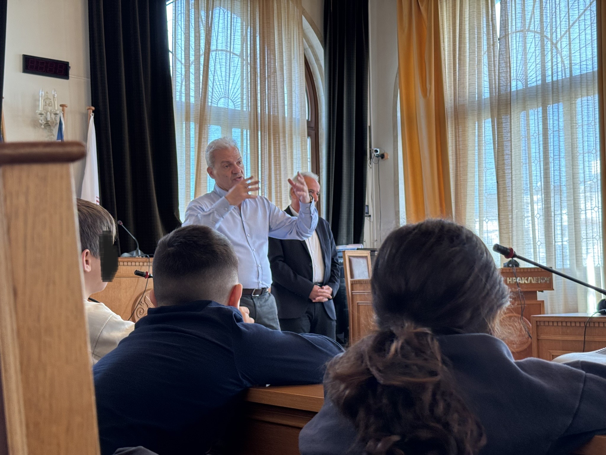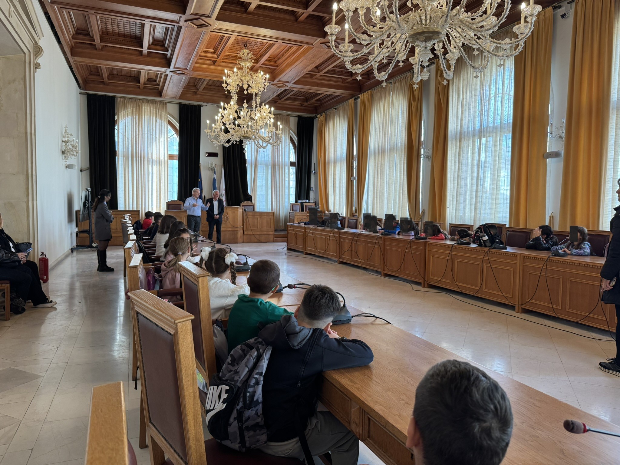 Τα παιδιά της Γ’ τάξης του 2ου Δημοτικού Σχολείου Ηρακλείου και τις εκπαιδευτικούς Ράνια Τσιτάκη, Μαρία Κρουσταλλάκη, Ιωάννα Δημοπούλου, Άντα Φανουράκη και Δέσποινα Καλλιμάνη, υποδέχθηκε ο Δήμαρχος Ηρακλείου Αλέξης Καλοκαιρινός μαζί με τον Αντιδήμαρχο Παιδείας Αντώνη Περισυνάκη, στην αίθουσα «Ελευθέριος Βενιζέλος» στη Λότζια, το πρωί της Τετάρτης 20 Νοεμβρίου.