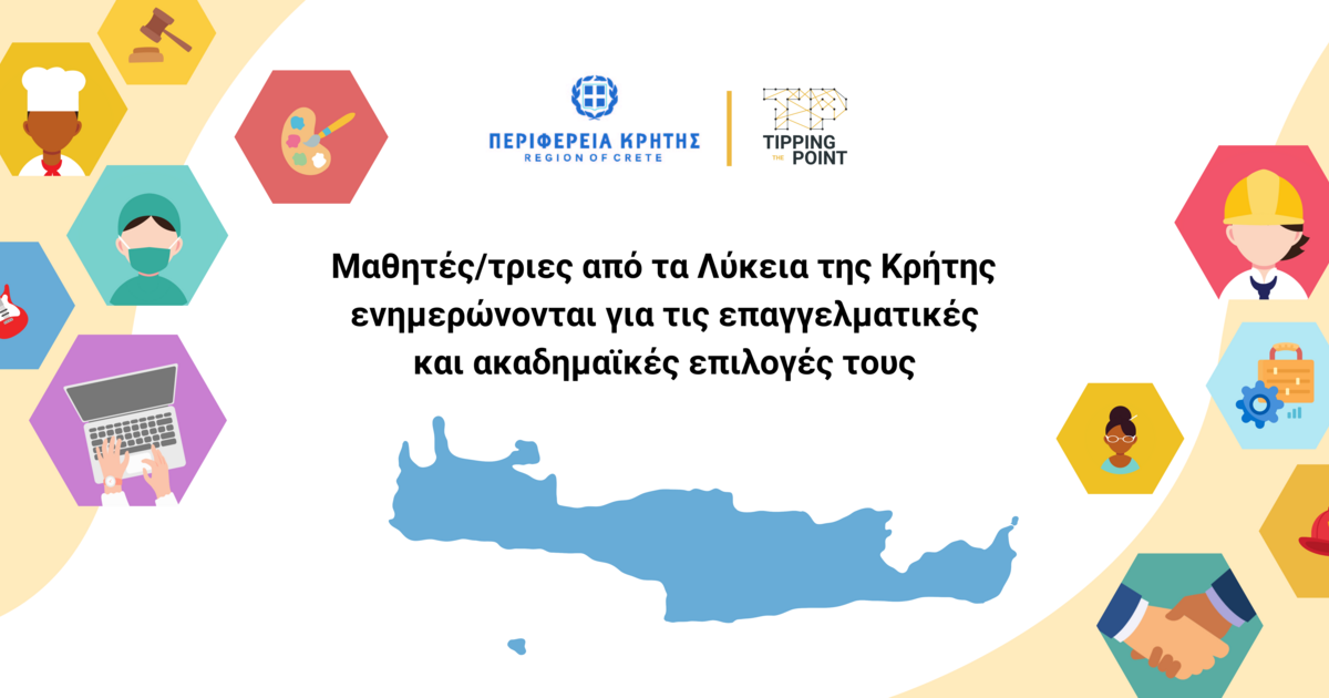 Η Περιφέρεια Κρήτης, για 4η συνεχή χρονιά, προσφέρει δωρεάν το πρόγραμμα επαγγελματικού προσανατολισμού The Tipping Point, σε όλα τα Λύκεια της Κρήτης.