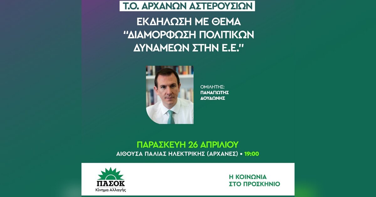 Έτσι την ερχόμενη Παρακευή 26 Απριλίου, η Τοπική Οργάνωση Αρχανών Αστερουσίων διοργανώνει, στις 19:00 το απόγευμα στην αίθουσα της Παλιάς Ηλεκτρικής στις Αρχάνες εκδήλωση με θέμα «Διαμόρφωση Πολιτικών Δυνάμεων στην Ευρωπαϊκή Ένωση» με ομιλητή τον βουλευτή Παναγιώτη Δουδωνή.