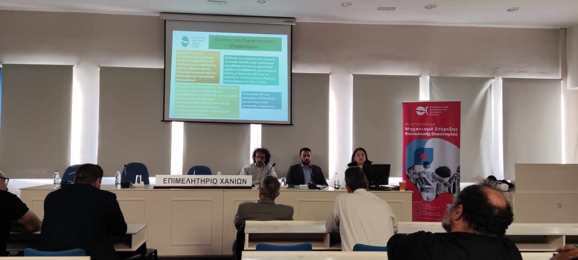 Με επιτυχία ολοκληρώθηκε η 2η ενημερωτική εκδήλωση με θέμα «Λειτουργία του Περιφερειακού Μηχανισμού Στήριξης και Ανάπτυξης της Κοινωνικής Επιχειρηματικότητας στην Περιφέρεια Κρήτης» που πραγματοποιήθηκε το απόγευμα της Τετάρτης 17 Απριλίου 2024 στην Αίθουσα του Επιμελητηρίου Χανίων.