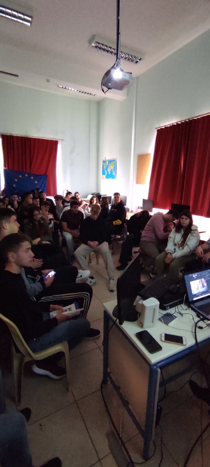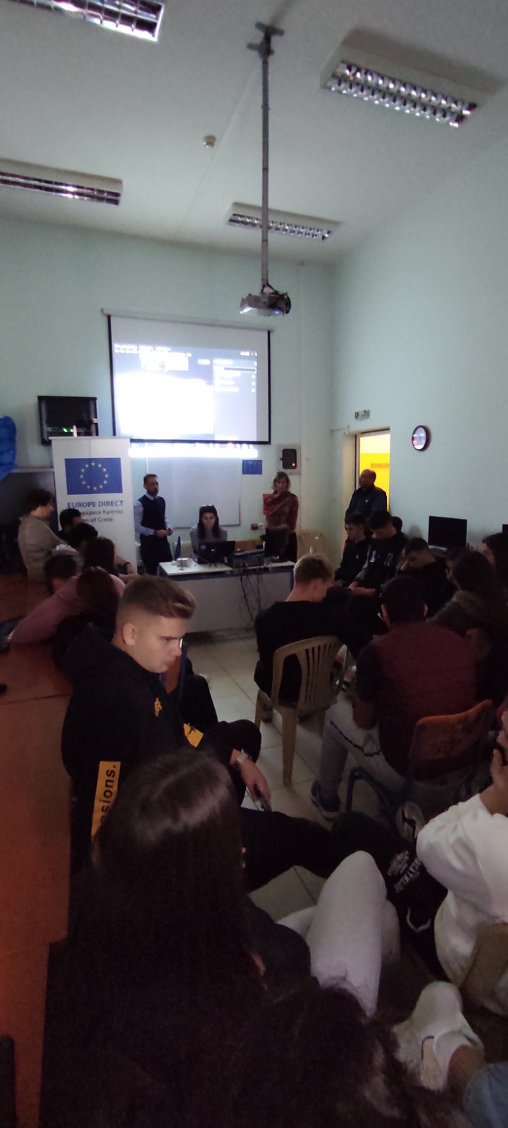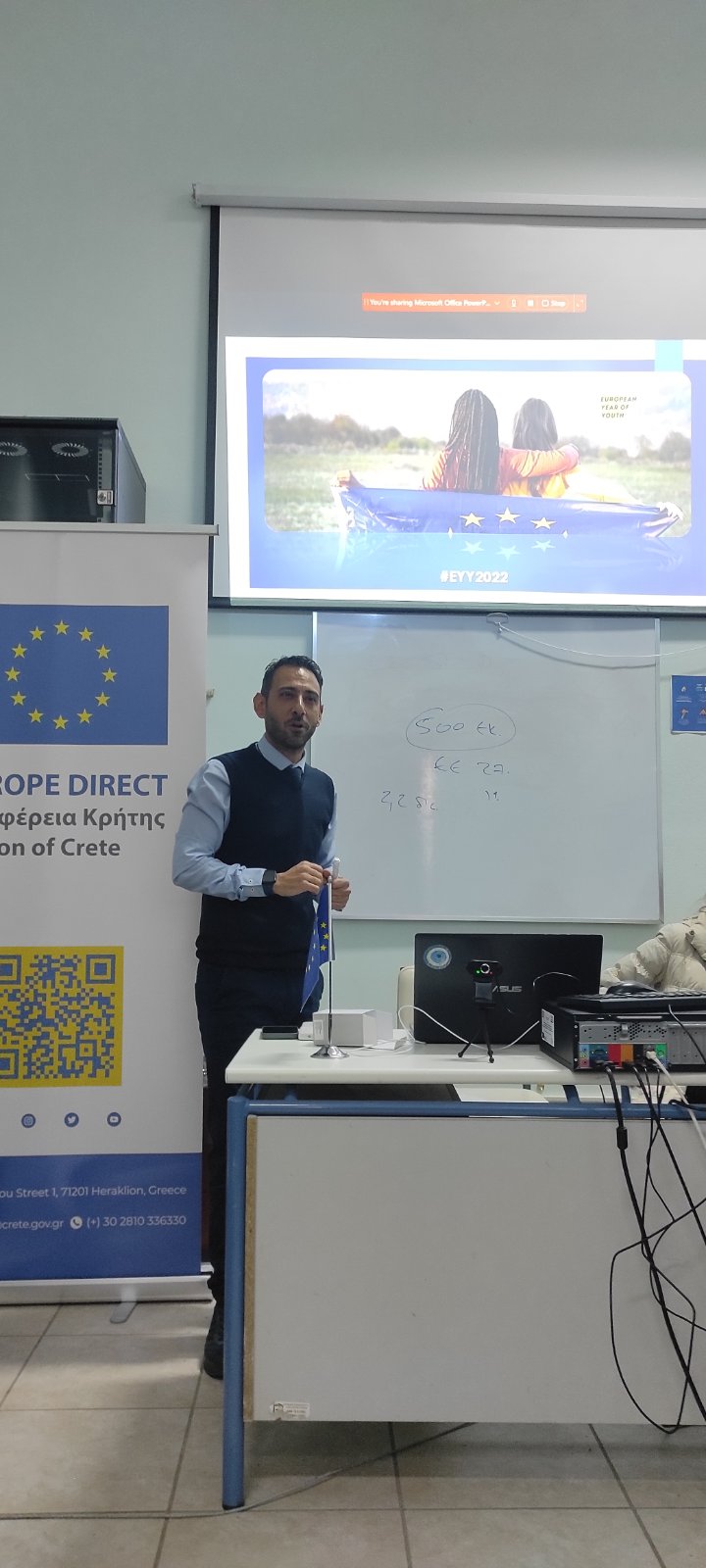 Το λόγο έλαβε στη συνέχει ο κύριος Μωραϊτάκης Νικόλας υπεύθυνος επικοινωνίας Europe Direct της Περιφέρειας Κρήτης. Το θέμα που πραγματεύτηκε ήταν το «Ευρωπαϊκό Έτος Νεολαίας 2022» και τι κάνει η Ευρωπαϊκή Ένωση για τους νέους. Συγκεκριμένα αναφέρθηκε σε όλα τα προγράμματα τα οποία είναι διαθέσιμα για τους νέους παροτρύνοντας τους να συμμετέχουν, καθώς όλοι μπορούν να λάβουν μέρος σε ένα τέτοιο πρόγραμμα. Τους παρουσίασε το Ευρωπαϊκό Σώμα Αλληλεγγύης, που αφορά συμμετοχή των νέων σε δραστηριότητες αλληλεγγύης είτε στη χώρα τους, είτε στο εξωτερικό. Διάλογος της ΕΕ για τη νεολαία, που είναι ο διάλογος της Ευρωπαϊκής Ένωσης για την νεολαία, το DiscoverEU που δίνει την ευκαιρία σε νέους να ταξιδέψουν δωρεάν καθώς και το Erasmus+. Το τελευταίο στηρίζει την κατάρτιση, την εκπαίδευση, τη νεολαία και τον αθλητισμό στην Ευρώπη. Παρέχει τη δυνατότητα σε νέες και νέους να σπουδάσουν, να κάνουν μαθήματα κατάρτισης και να αποκτήσουν εμπειρία στο εξωτερικό. Έδωσε αναλυτικές οδηγίες στους μαθητές στο πως μπορούν το που μπορούν να βρουν πληροφορίες και να κάνουν μία αίτηση σε όλα αυτά τα προγράμματα και να συμμετέχουν. Οι μαθητές έδωσαν ιδιαίτερο ενδιαφέρον και προσοχή στις ομιλίες καθώς ήταν πράγματα τα οποία τους ενδιαφέρουν και μπορούν άμεσα να λάβουν μέρος.