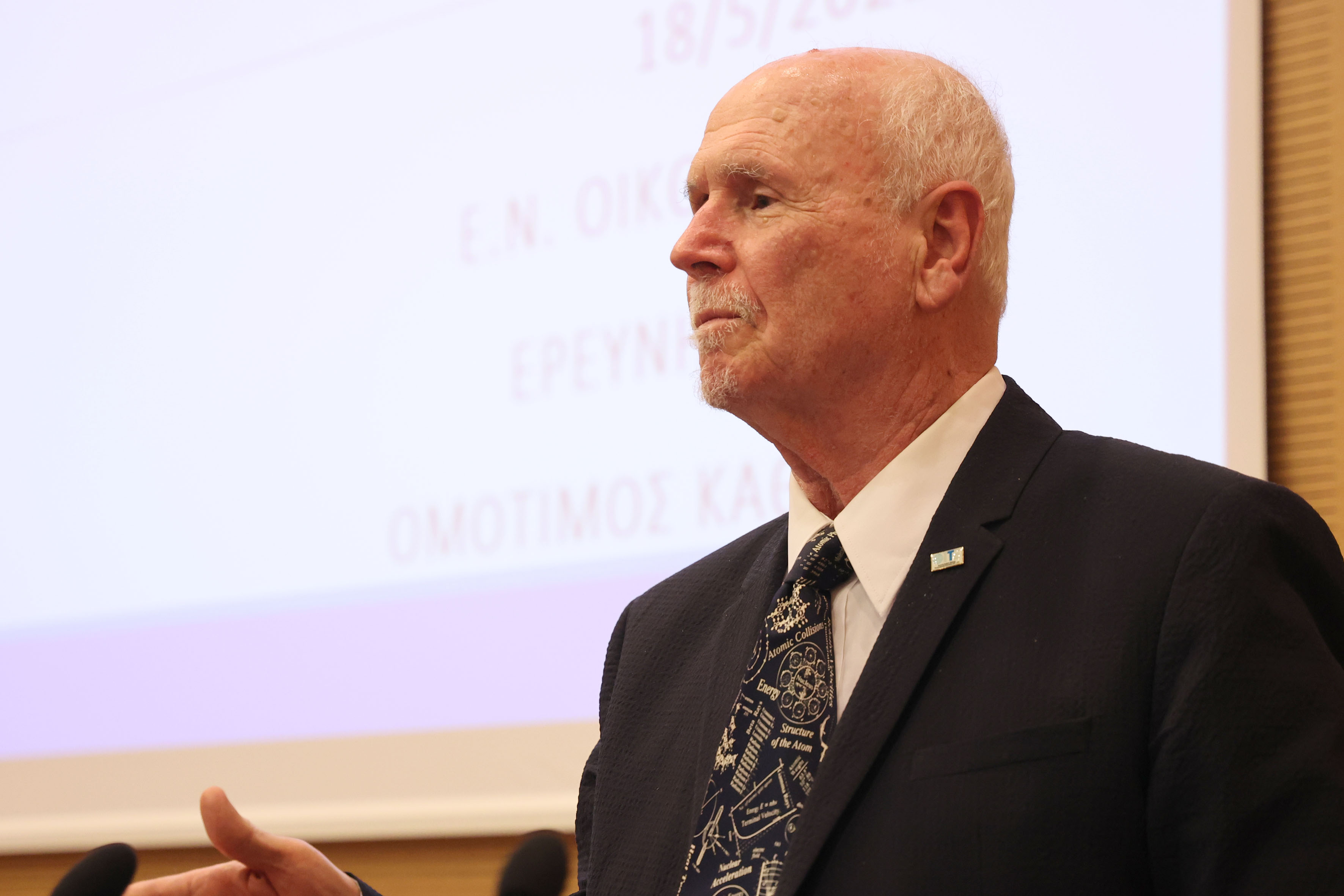 Για το έργο και την προσωπικότητα του τιμώμενου μίλησε ο Ομότιμος Καθηγητής του Πανεπιστημίου Πατρών, πρώην διευθυντής του Ινστιτούτου Χημικής Μηχανικής στην Πάτρα (ενός από τα Ινστιτούτα του ΙΤΕ) και προσωπικός φίλος του κ. Οικονόμου Γεώργιος Παπαθεοδώρου.