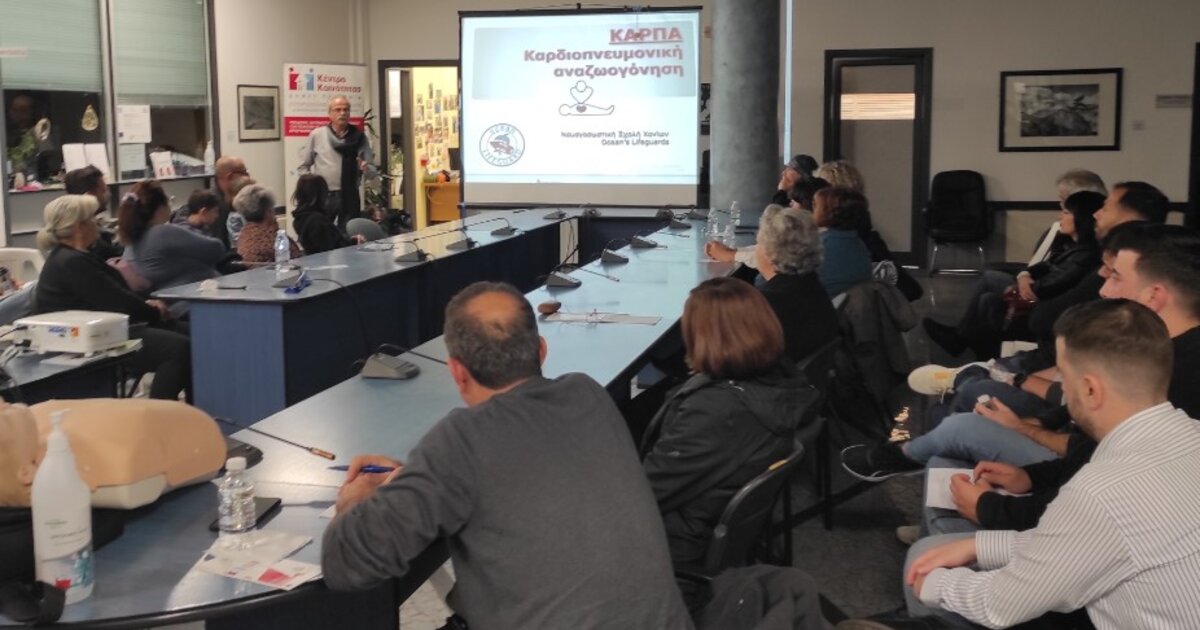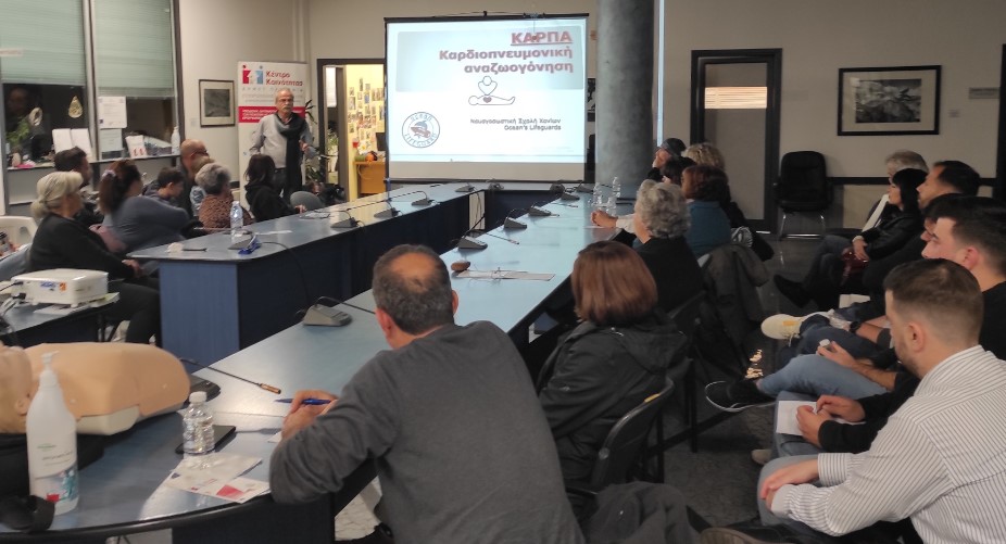 Ο εκπαιδευτής κος Καραζεπούνης παρουσίασε εκτενώς τη διαδικασία παροχής πρώτων βοηθειών μέσω καρδιοαναπνευστικής αναζωογόνησης(ΚΑΡΠΑ), με τη χρήση απινιδωτή και την λαβή Heimlich σε περίπτωση πνιγμονής. Για όλα τα παραπάνω έδωσε ξεχωριστές οδηγίες σε περίπτωση ενηλίκων, παιδιών, βρεφών και εγκύων και οι εκπαιδευόμενοι είχαν τη δυνατότητα να εφαρμόσουν τις τεχνικές που έμαθαν.