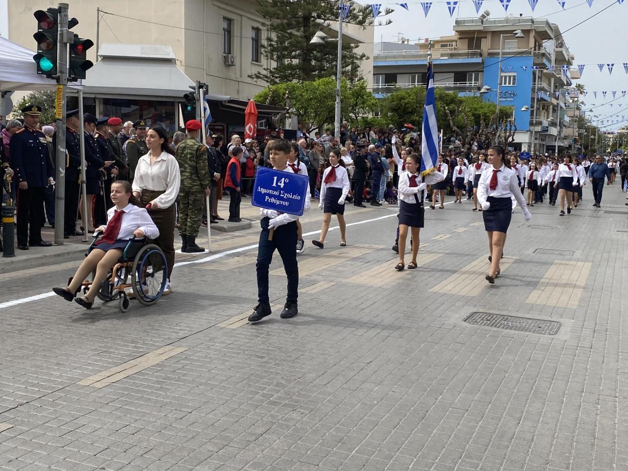 Ακολούθησε η καθιερωμένη παρέλαση στην Λεωφόρο Κουντουριώτη στην οποία συμμετείχαν Τμήματα Πολιτιστικών συλλόγων, Μαθητών, Σπουδαστών, Ενόπλων Δυνάμεων και Σωμάτων Ασφαλείας και η Δημοτική Φιλαρμονική του Δήμου Ρεθύμνης.