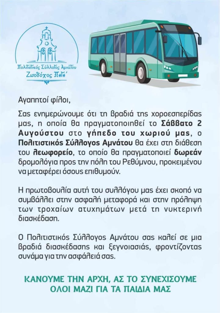 Ο Πολιτιστικός Σύλλογος Αμνάτου και φέτος αποδεικνύει έμπρακτα την κοινωνική του ευαισθησία, παίρνοντας μια σημαντική πρωτοβουλία με στόχο την ασφάλεια των κατοίκων και επισκεπτών του χωριού. Με αφορμή τη χοροεσπερίδα που θα πραγματοποιηθεί το Σάββατο 2 Αυγούστου στο γήπεδο του χωριού, ο Σύλλογος ανακοίνωσε τη δωρεάν μετακίνηση του κόσμου με λεωφορείο που θα εκτελεί δρομολόγια προς και από το Ρέθυμνο, εξυπηρετώντας όσους επιθυμούν να επιστρέψουν με ασφάλεια μετά την εκδήλωση.