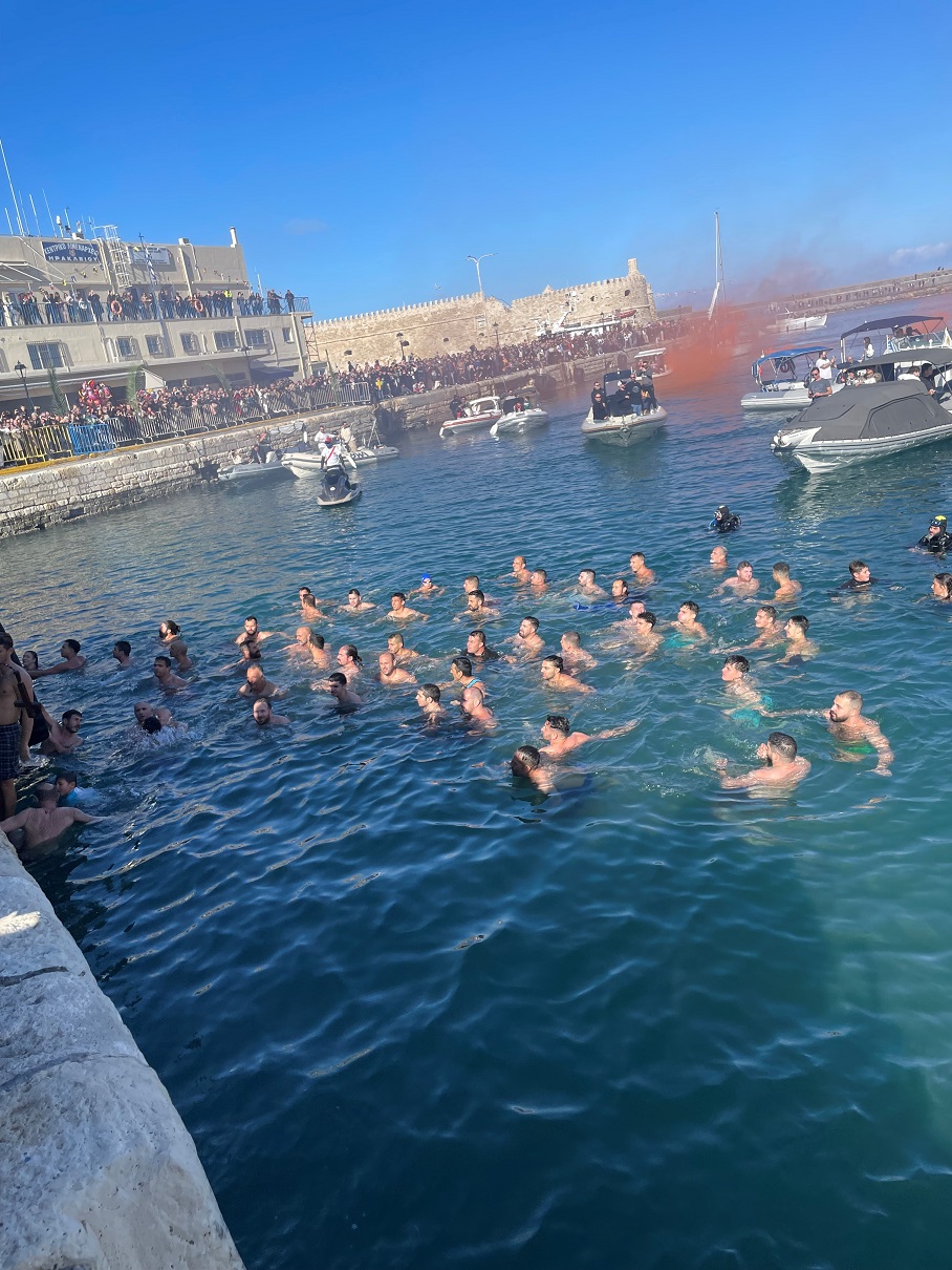 Η εντυπωσιακή με βάγιες στολισμένη προβλήτα έμπροσθεν του κτιρίου του ΟΛΗ υποδέχθηκε το πλήθος των πιστών δίδοντας θερμό και ομολογιακό παρόν. Δεκάδες «βουτηχτάδες» περίπου πενήντα μεταξύ αυτών και μικρά παιδιά, έπεσαν στο νερό για να πιάσουν τον σταυρό ώστε να τύχουν της ευλογίας του. Τυχερός όμως ήταν ο Γρηγόρης Πολίτης από το Θραψανό ο οποίος ανέσυρε τον Σταυρό και στον οποίο ο Αρχιεπίσκοπος Κρήτης Ευγένιος έδωσε τις ευλογίες του και τόνισε στο μήνυμα του ότι «Μακριά από σκοτάδια και σκοταδισμούς. Έχουμε το φως του Χριστού και μπορούμε να το προσλαμβάνουμε και να το εξακτινώνουμε. Να γινόμαστε δέκτες και πομποί του, για να φωτιστεί όλος ο κόσμος».