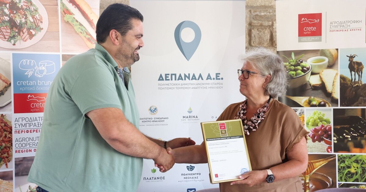 Το σήμα «Κρητική Κουζίνα» της Αγροδιατροφικής Σύμπραξης της Περιφέρειας Κρήτης απονεμήθηκε για μια ακόμη χρονιά στο καφέ ΜΑΡΙΝΑ, σε μια σεμνή τελετή παρουσία της Προέδρου της ΔΕΠΑΝΑΛ ΑΕ Στέλας Αρχοντάκη - Καλογεράκη, του Προέδρου της Αγροδιατροφικής Σύμπραξης Σταύρου Τζεδάκη και του Διευθυντή Επιχειρηματικού Τομέα της ΔΕΠΑΝΑΛ ΑΕ Μιχάλη Ριζικιανάκη.