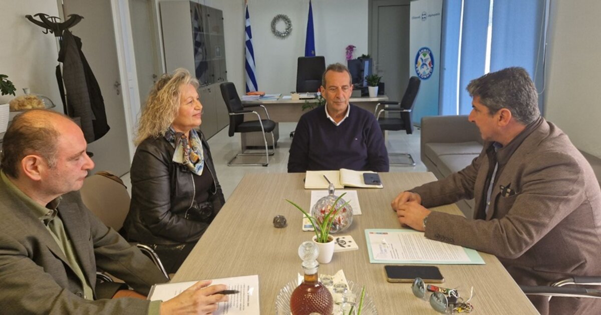 Εθιμοτυπική συνάντηση με τον Δήμαρχο Χερσονήσου, Ζαχαρία Δοξαστάκη είχαν σήμερα στο Δημαρχείο στις Γούρνες ο πρόεδρος της Ένωσης Επιχειρηματιών Ενοικιαζόμενων Διαμερισμάτων και Δωματίων Ν. Ηρακλείου, «Η ΦΙΛΟΞΕΝΙΑ», Γιώργος Χριστοδουλάκης, η γενική γραμματέας Στέλλα Τσακονίκου – Βλαστού και το μέλος του Συλλόγου – διευθυντής του Μουσείου «Λυχνοστάτης», Γιάννης Μαρκάκης.