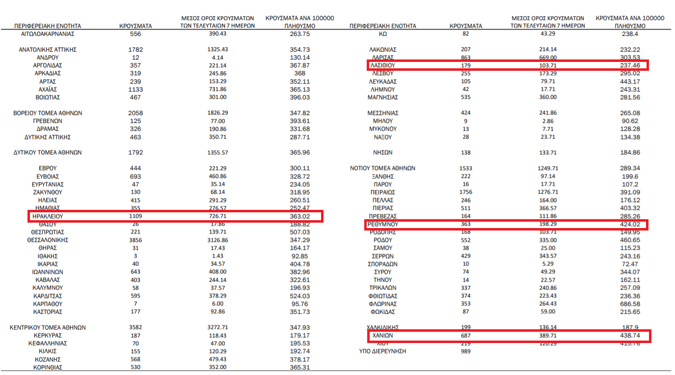 Στον πίνακα που ακολουθεί δείτε πώς διαμορφώνεται η γεωγραφική κατανομή των νέων μολύνσεων ανά την επικράτεια: