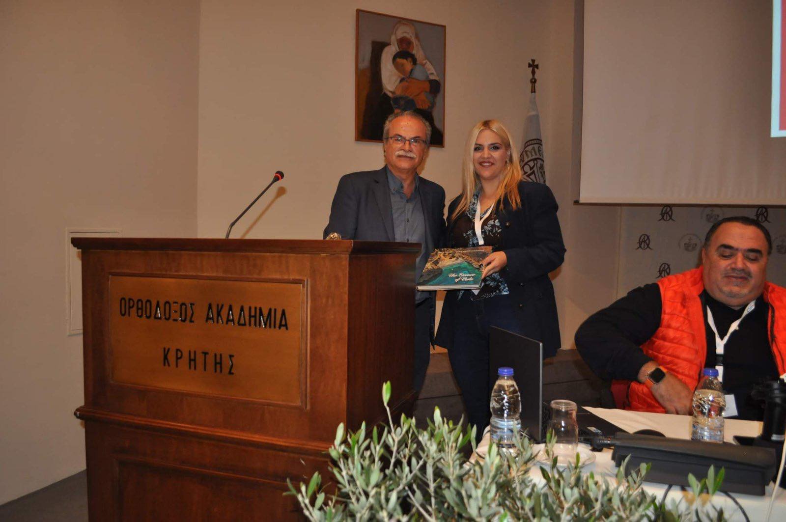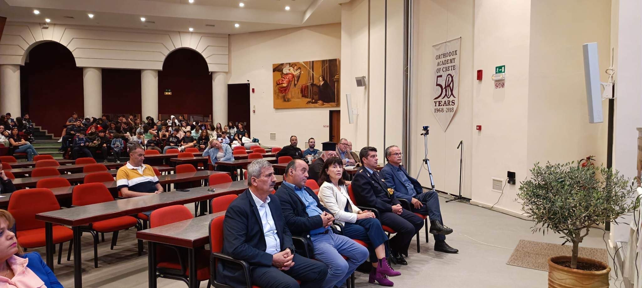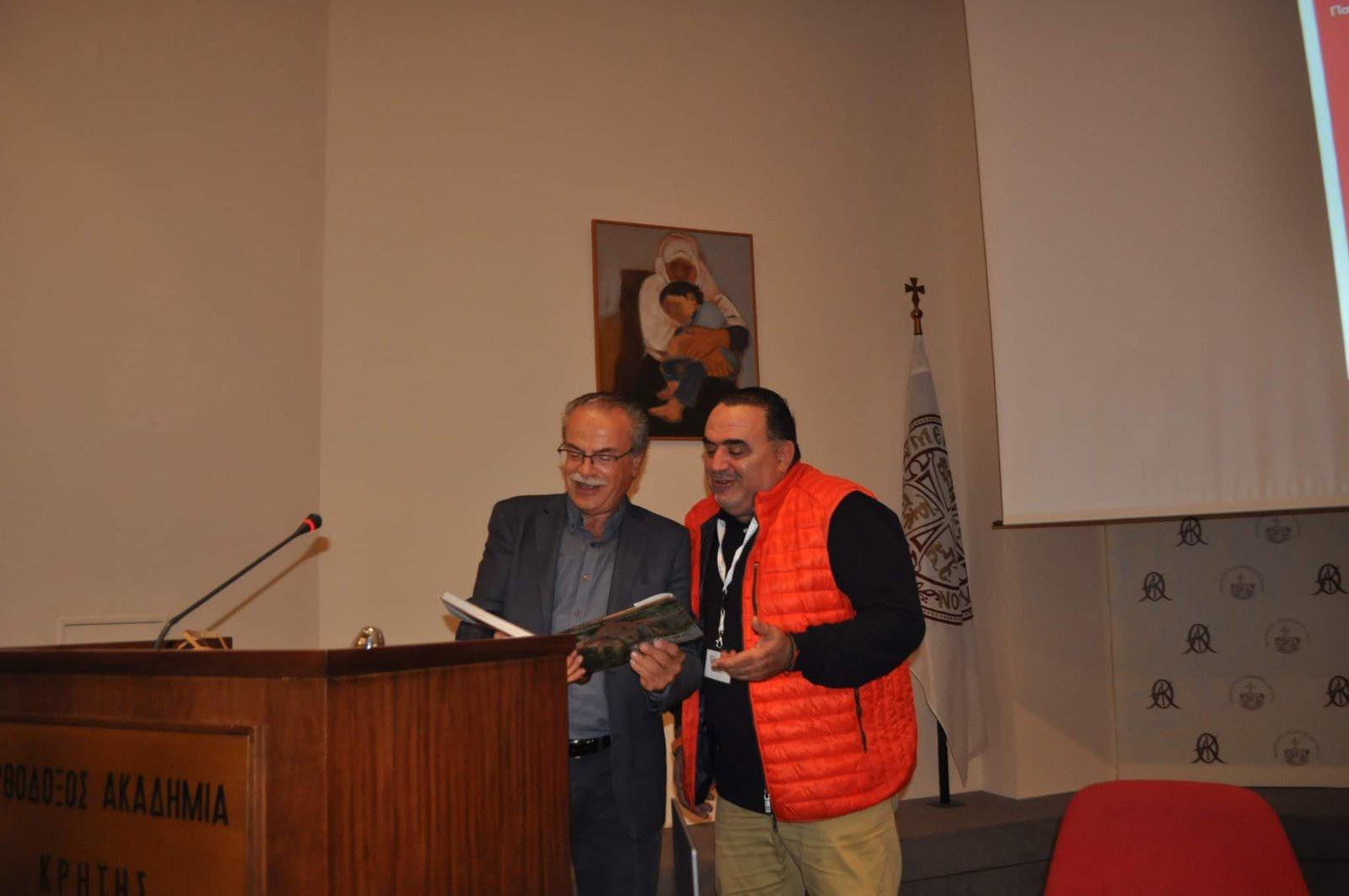 Χαιρετισμό στην ημερίδα επίσης απηύθυναν η Εντεταλμένη Περιφερειακή Σύμβουλος κ. Σοφία Μαλανδράκη- Κρασουδάκη και εκ μέρους των συνδιοργανωτών ο Διευθυντής της Ορθόδοξης Ακαδημίας Κρήτης κ. Κων/νος Ζορμπάς και η Πρόεδρος του Συλλόγου Κυριών και Δεσποινίδων Βουκολιών κ. Αθανασία Καραπατάκη και ενώ επίσης παρέστησαν οι Αντιδήμαρχοι Πλατανιά κ. Ασπασία Λουπάκη, Χρυσούλα Μαραγκουδάκη και Γιώργος Καλαϊτζάκης, ο Εντεταλμένος Δημοτικός Σύμβουλος Παιδείας κ. Γιάννης Δαράκης, ο επικεφαλής της μείζονος αντιπολίτευσης Πλατανιά κ. Μανώλης Ντουντουλάκης, ο Διοικητής Πυροσβεστικών Υπηρεσιών Χανίων κ. Ξενοφών Τσιλιμιγκάκης, ο Διοικητής της Τροχαίας Χανίων κ. Γιάννης Βλαχάκης, διευθυντές και μαθητές των σχολικών μονάδων Δευτεροβάθμιας Εκπαίδευσης του Δήμου Πλατανιά καθώς και πολλοί γονείς. Μετά το τέλος της παρουσίασης ο κ. Μαλανδράκης προσέφερε στους ομιλητές το φωτογραφικό λεύκωμα του Δήμου Πλατανιά “Η Πεμπτουσία της Κρήτης”, ως αναμνηστικό δώρο.