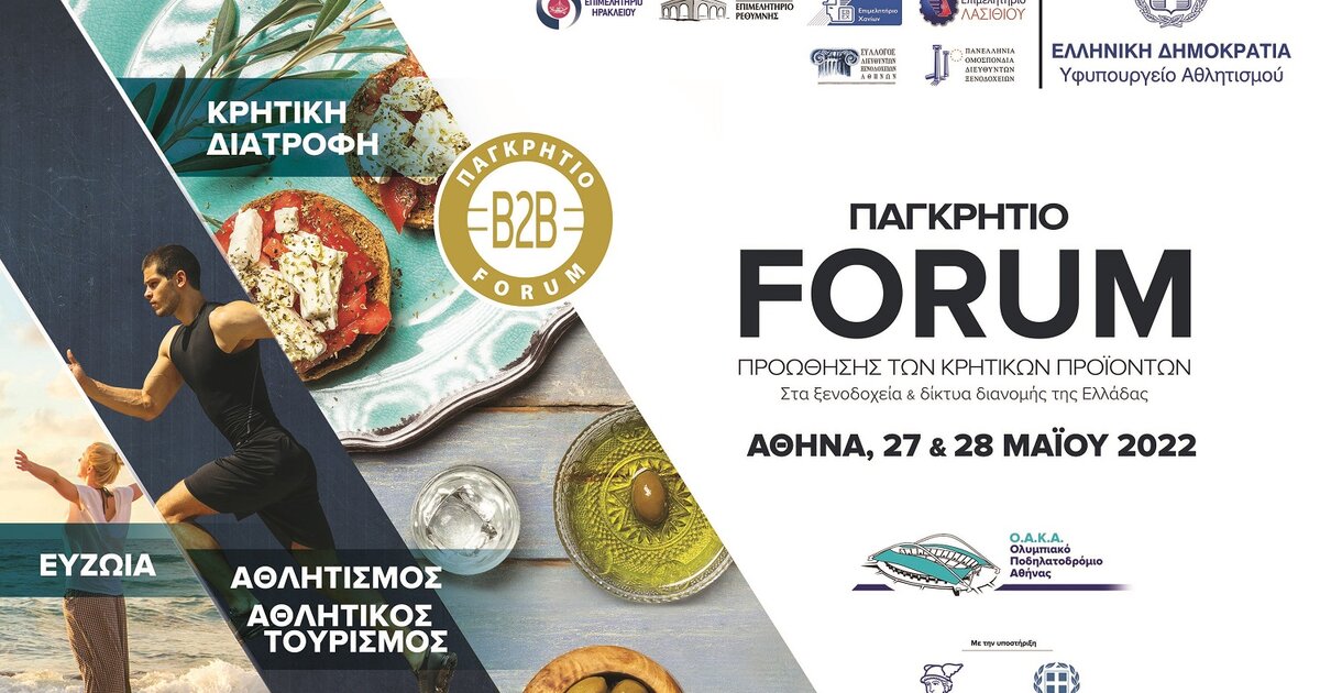 Ολοκληρώνεται αύριο η διαδικασία υποβολής αιτήσεων για ΔΩΡΕΑΝ συμμετοχή στο ΠΑΓΚΡΗΤΙΟ ΦΟΡΟΥΜ ΠΡΟΩΘΗΣΗΣ ΚΡΗΤΙΚΩΝ ΠΡΟΪΟΝΤΩΝ, το οποίο θα πραγματοποιηθεί στις 27 και 28 Μαΐου στο Ολυμπιακό Στάδιο της Αθήνας (ΟΑΚΑ).