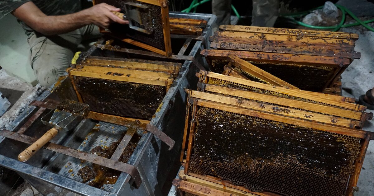 Όσο οι ίδιες οι μέλισσες κοιμούνται, ένα μικρό «μελίσσι» από άνδρες δουλεύει ασταμάτητα, απομακρύνοντας με ξύστρες το σφράγισμα του κεριού από τις κηρύθρες με το μέλι, τις οποίες στη συνέχεια τοποθετεί στους μελιτοεξαγωγείς. Καθώς αυτοί περιστρέφονται με ταχύτητα, η νύχτα αρωματίζεται με μια γλυκιά μυρωδιά από βότανα, ενώ το μέλι κυλά παχύρρευστο από την κάνουλα στο κάτω μέρος του μηχανήματος.