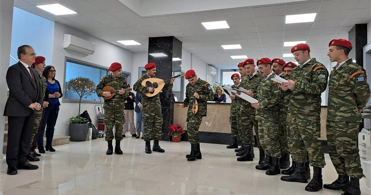 Οι φαντάροι της 5ης Αερομεταφερόμενης Ταξιαρχίας με την επιλοχία τους, έψαλλαν παραδοσιακά κάλαντα από την Κρήτη και την υπόλοιπη Ελλάδα, υπό τη συνοδεία λύρας και λαούτου ενώ απηύθυναν στον Δήμαρχο και εξαιρετικές μαντινάδες.