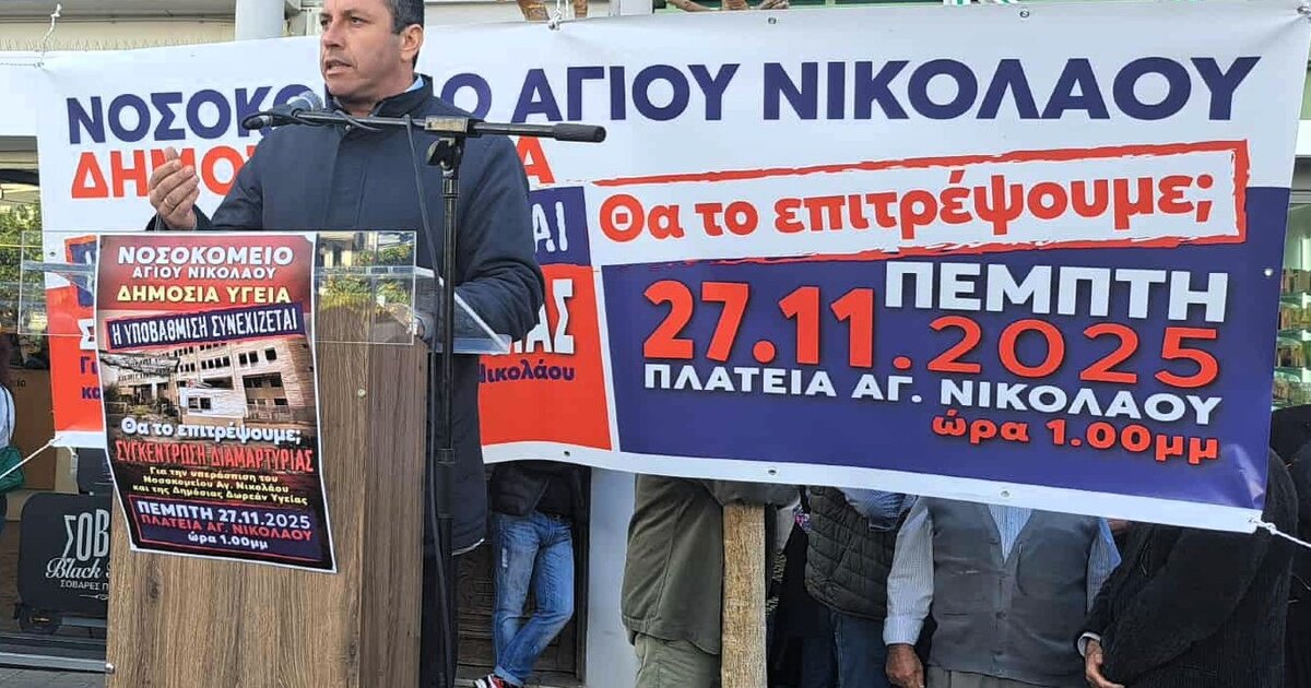 Το ξεκάθαρο μήνυμα ότι ο Δήμος Αγίου Νικολάου και οι πολίτες του θα συνεχίσουν να διεκδικούν νοσοκομειακές δομές δυνατές, πλήρως στελεχωμένες και σύγχρονες που θα υπηρετούν με ασφάλεια και αξιοπρέπεια κάθε πολίτη, εξέπεμψε ο Δήμαρχος Αγίου Νικολάου Μανώλης Μενεγάκης κατά τη συγκέντρωση διαμαρτυρίας για την υπεράσπιση της Δημόσιας Υγείας και του Νοσοκομείου Αγίου Νικολάου που πραγματοποιήθηκε την Πέμπτη 27 Νοεμβρίου 2025 στην κεντρική πλατεία της πόλεως.
