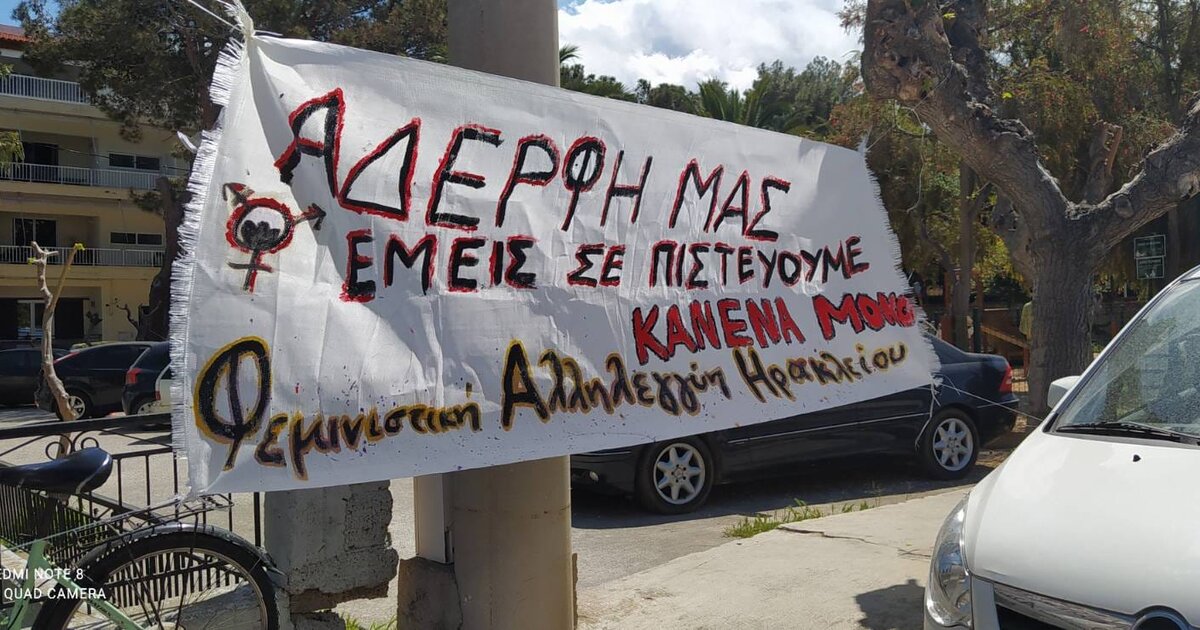 Έξω από το Δικαστικό Μέγαρο έχουν συγκεντρωθεί μέλη της Φεμινιστικής Αλληλεγγύης Ηρακλείου και οι "Catσούλες" προς στήριξη της κοπέλας.