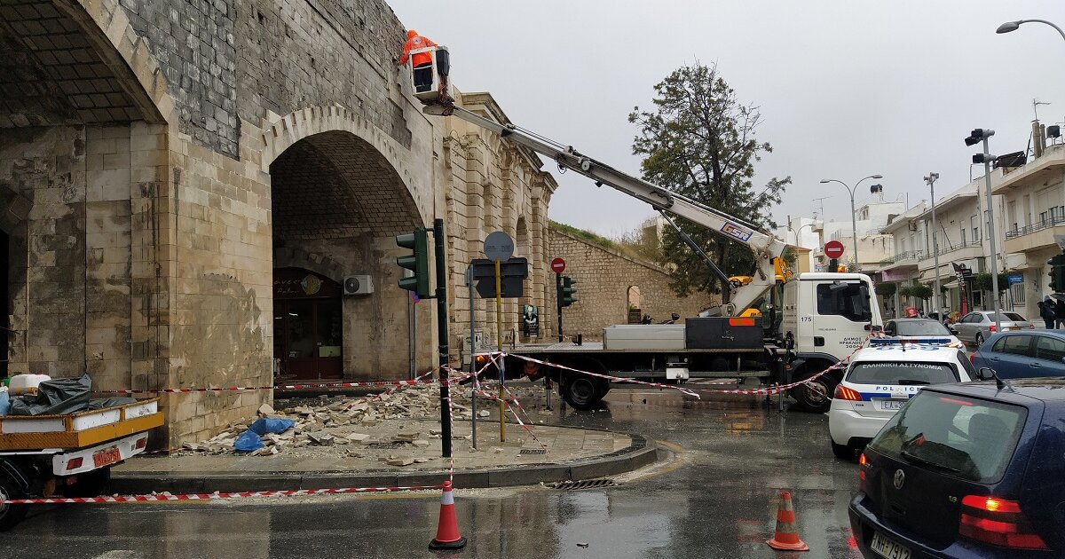 Καθαιρείται η επικάλυψη της λιθεπένδυσης και ελέγχεται και το σημείο της καμάρας, στην Πύλη Ιησού, στο Ηράκλειο, μετά τη αποκόλληση τμήματος που από καθαρή τύχη δεν καταπλάκωσε διερχόμενο πεζό ή όχημα.