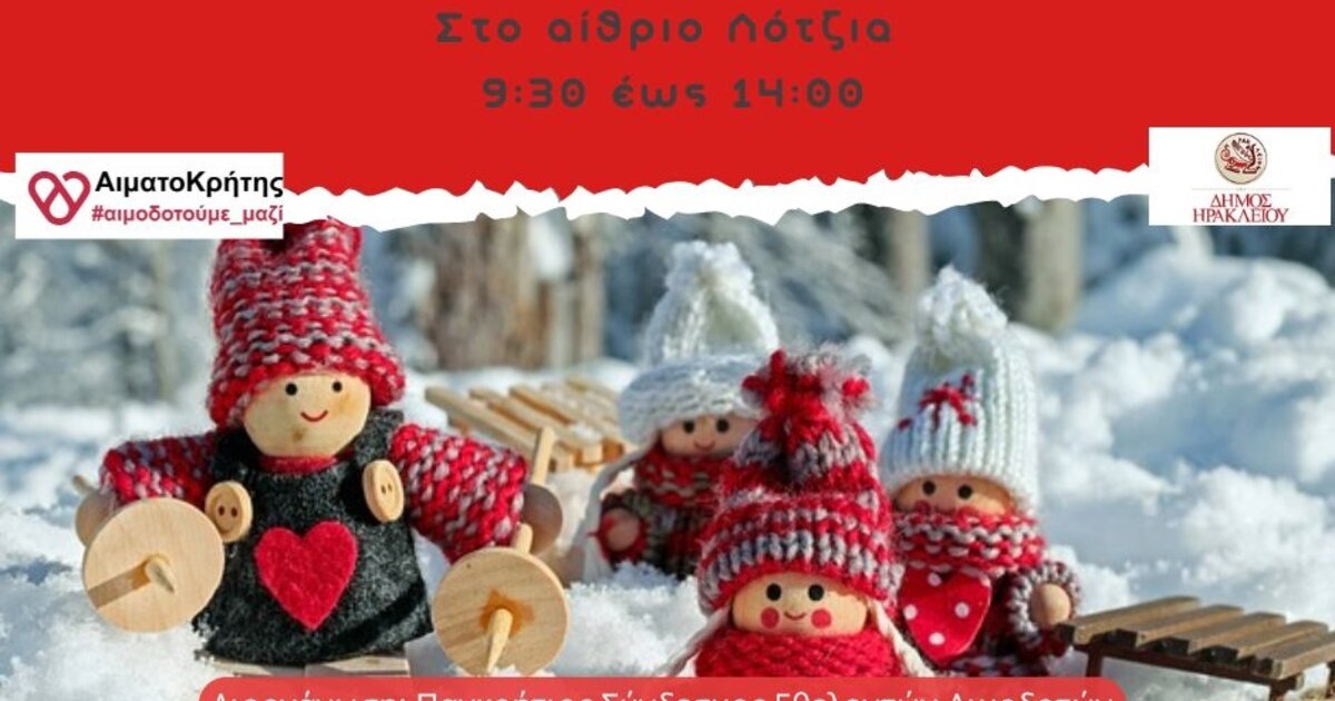 Το Σάββατο 30 Νοεμβρίου 2024 θα πραγματοποιηθεί εθελοντική αιμοδοσία στο κέντρο της πόλης του Ηρακλείου και συγκεκριμένα στο αίθριο της Λότζια από τις 09:30 έως τις 14:00.