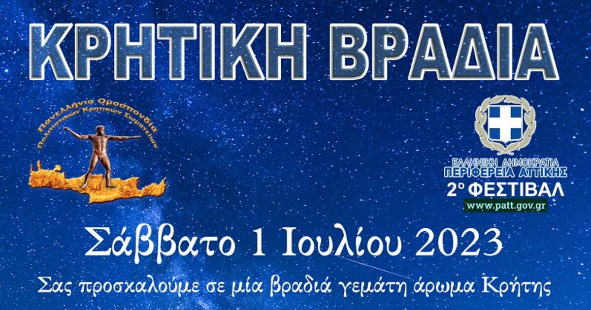Κρητική Βραδιά, διοργανώνει το Σάββατο 1η Ιουλίου, η Πανελλήνια Ομοσπονδία Πολιτιστικών Κρητικών Σωματείων.