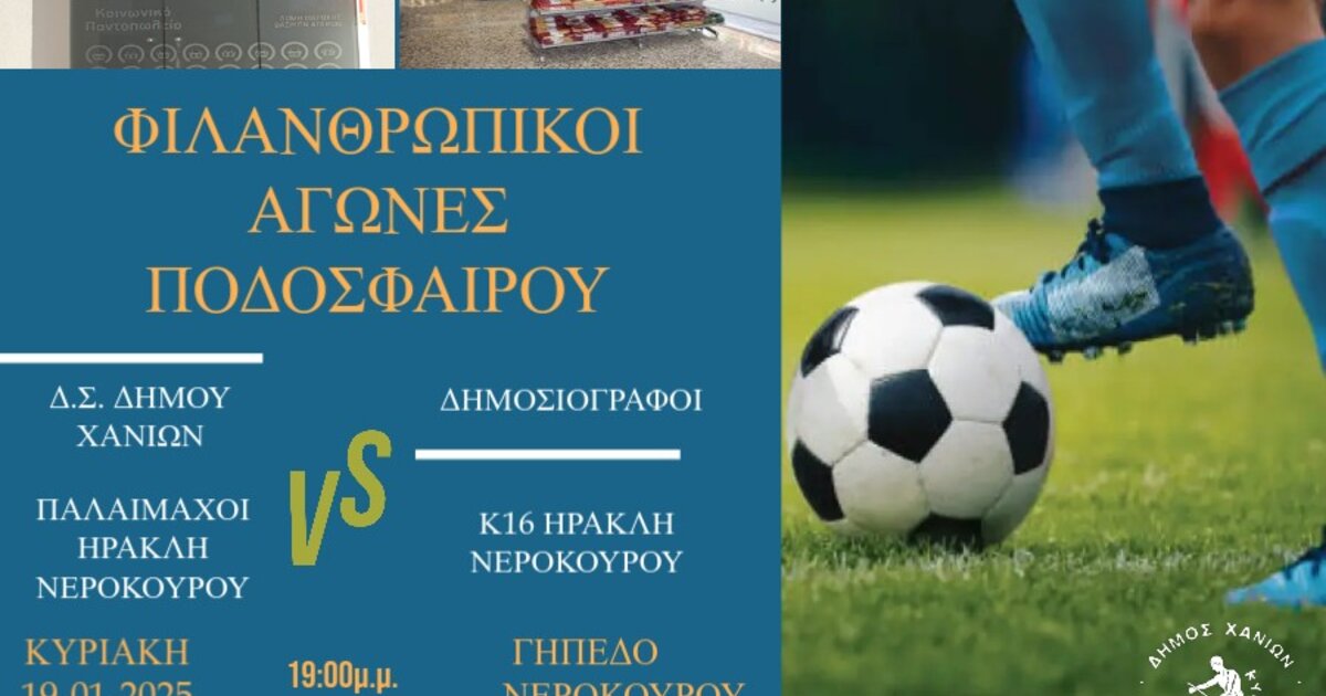 Μια «διαφορετική» ποδοσφαιρική αναμέτρηση για καλό σκοπό θα πραγματοποιηθεί την Κυριακή 19 Ιανουαρίου 2025, στις 19:00, στο Γήπεδο Νεροκούρου, με σκοπό την ενίσχυση του Κοινωνικού Παντοπωλείου του Δήμου Χανίων.