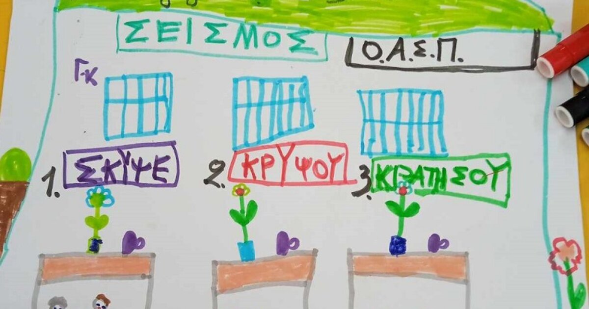 «Σκύψε, κρύψου, κρατήσου»: Με μια ζωγραφιά οι μαθητές της Βιάννου έδειξαν πως αντιδρούμε σε έναν σεισμό.