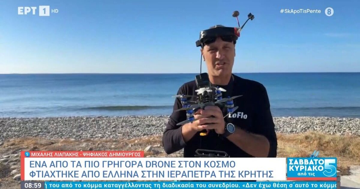 Ο ψηφιακός δημιουργός Μιχάλης Λιαπάκης, από την Ιεράπετρα, μίλησε το πρωί του Σαββάτου στην εκπομπή Σαββατοκύριακο από τις 5 στην ΕΡΤ1 για το drone που εχει φτιάξει, με επιτάχυνση 300χλμ σε 2 δευτερόλεπτα!