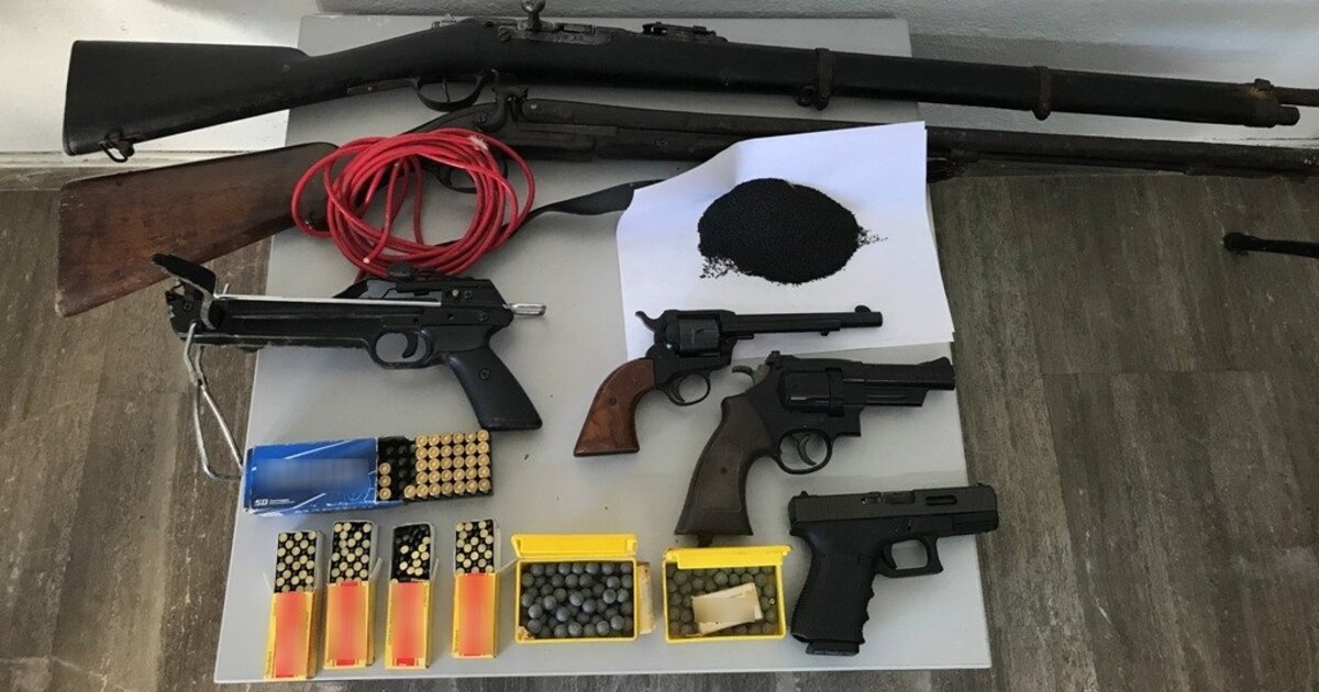 Βρεθήκαν και κατασχέθηκαν πολεμικό τουφέκι, δύο πιστόλια, κυνηγητικό όπλο, περίστροφα, φυσίγγια, και πυρίτιδα