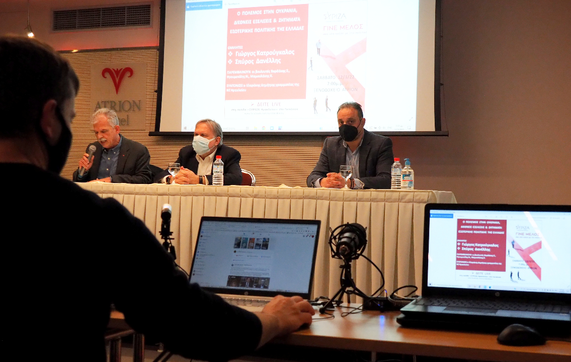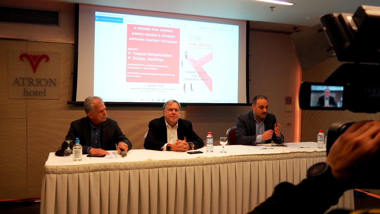 Η απερίφραστη καταδίκη του πολέμου στην Ουκρανία και η ανάγκη κινητοποίησης εγχώριων αλλά και υπερεθνικών θεσμών στην υπεράσπιση της ειρήνης ήταν το μήνυμα της ανοιχτής πολιτικής εκδήλωσης με τίτλο «Ο πόλεμος στην Ουκρανία, διεθνείς εξελίξεις και ζητήματα εξωτερικής πολιτικής της Ελλάδας», που διοργάνωσε η Νομαρχιακή Επιτροπή Ηρακλείου του ΣΥΡΙΖΑ-ΠΣ, με κεντρικούς ομιλητές τον τομεάρχη Εξωτερικών του κόμματος Γιώργο Κατρούγκαλο και τον πρώην βουλευτή Ηρακλείου και μέλος του Πολιτικού Συμβουλίου Σπύρο Δανέλλη. Η εκδήλωση πραγματοποιήθηκε το Σάββατο, 12 Μαρτίου, στο ξενοδοχείο Atrion, στο Ηράκλειο, με την ενεργή συμμετοχή πλήθους πολιτών και εκπροσώπων των τοπικών φορέων.