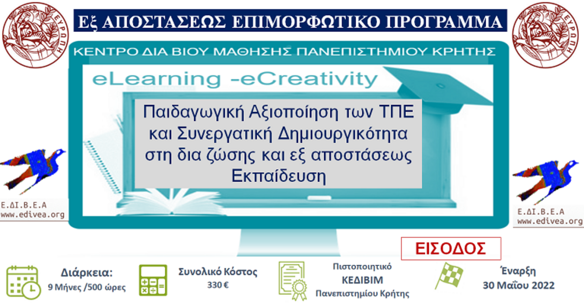 Το Εργαστήριο Προηγμένων Μαθησιακών Τεχνολογιών στην Δια Βίου και Εξ Αποστάσεως Εκπαίδευση [Ε.ΔΙ.Β.Ε.Α], στο πλαίσιο του ΚΕ.ΔΙΒ.ΙΜ του Πανεπιστημίου Κρήτης διοργανώνει μοριοδοτούμενο Εξ Αποστασεως Επιμορφωτικό σεμινάριο για εκπαιδευτικούς Α΄θμιας και Β΄θμιας εκπαίδευσης και απόφοιτους Γ΄θμιας εκπαίδευσης με θέμα: