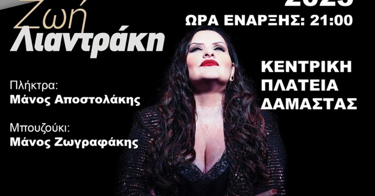 Το Σάββατο 12 Αυγούστου 2023 και ώρα 9.00 μ.μ., στην κεντρική πλατεία Δαμάστας, θα πραγματοποιηθεί μουσική συναυλία με την Ζωή Λιαντράκη. Στα πλήκτρα ο Μάνος Αποστολάκης και στο μπουζούκι ο Μάνος Ζωγραφάκης.