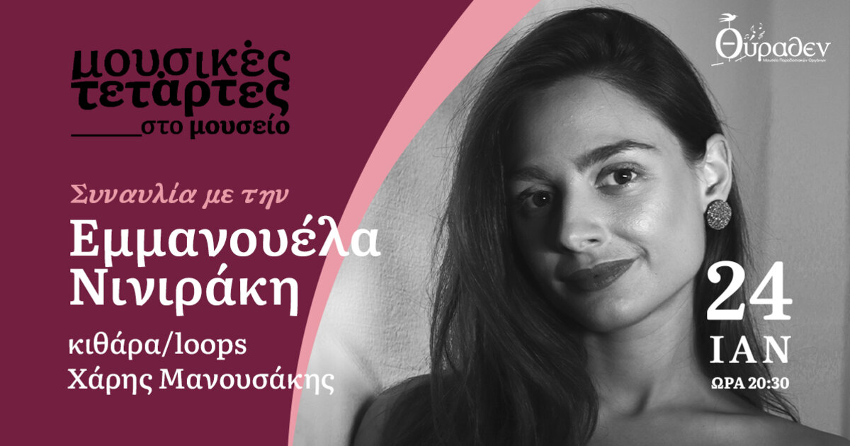 Στα πλαίσια των εκδηλώσεων των συναυλιών που διοργανώνει το Μουσείο Θύραθεν τις τετάρτες.Την Τετάρτη 24/01/2024 και ώρα 20:30, πρόκειται να παρουσιάσει την δουλειά της η Εμμανουέλα Νινιράκη μαζί με τον Χάρη Μανουσάκη σε μία συναυλία με επίκεντρο την Μουσική. Έτσι στον εσωτερικό χώρο του Μουσείο δίπλα από τα εκθέματα θα ταξιδέψουμε μουσικά.