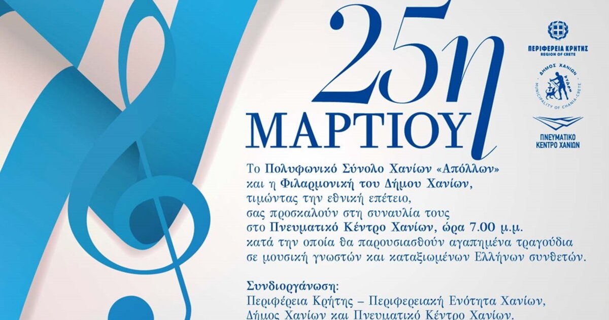 Το Πολυφωνικό Σύνολο Χανίων «Απόλλων» και η Φιλαρμονική του Δήμου Χανίων, τιμώντας την εθνική επέτειο της 25ης Μαρτίου, παρουσιάζουν συναυλία με αγαπημένα τραγούδια σε μουσική γνωστών και καταξιωμένων Ελλήνων συνθετών στο Πνευματικό Κέντρο Χανίων, τη Δευτέρα, 25 Μαρτίου 2024 και ώρα 7.00 μ.μ.