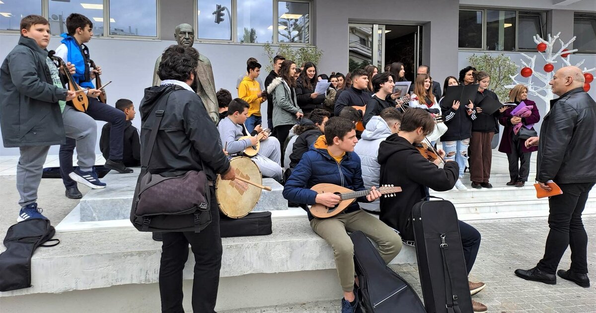 Με κρητικά, μοραΐτικα, βυζαντινά, αλβανικά και κάλαντα της Κάτω Ιταλίας, αιφνιδίασαν ευχάριστα το Δήμαρχο κ. Γ. Μαρινάκη, τους εργαζόμενους αλλά και τους διερχόμενους πολίτες από τον αύλειο χώρο του Δημαρχείου, το Σύνολο Παραδοσιακής Μουσικής του Μουσικού Σχολείου Ρεθύμνου.