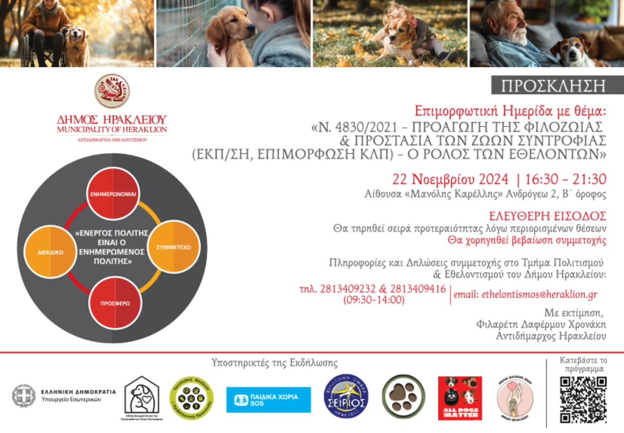 Ο Δήμος Ηρακλείου συνεχίζει τις δράσεις ενημέρωσης και εκπαίδευσης του κοινού (εθελοντών και μη), στο πλαίσιο του Β΄ Κύκλου των σεμιναρίων για την προαγωγή της φιλοζωίας και την προστασία των ζώων.