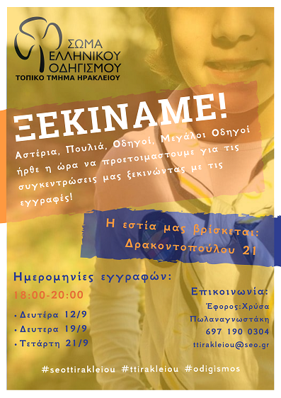 Οι Εγγραφές στις ομάδες για παιδιά από 5 έως 17 ετών & για όποιον ενήλικα θέλει να γίνει εθελοντής και να στελεχώσει το αρχηγείο θα γίνουν: