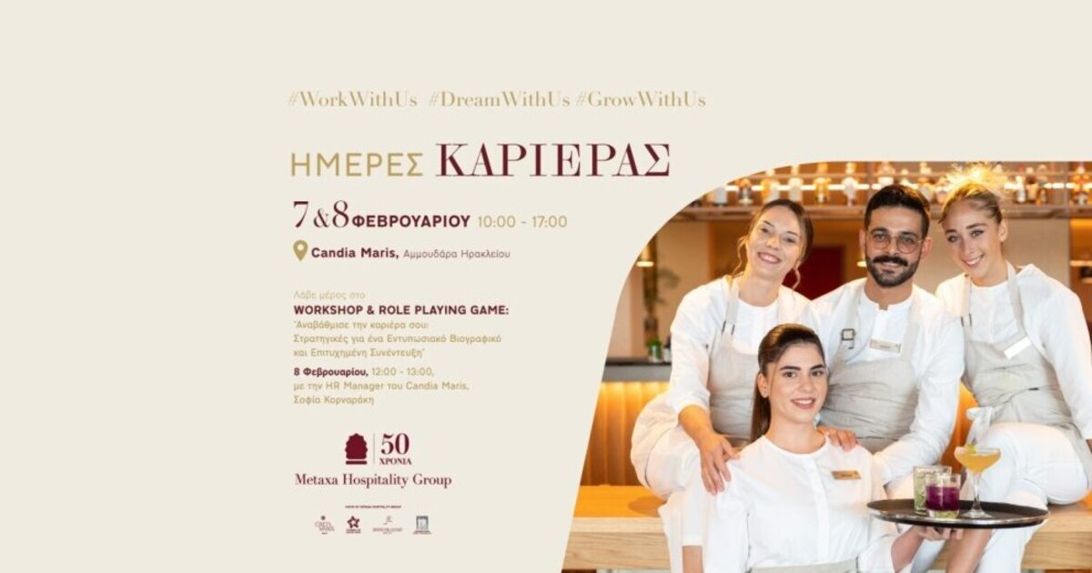 Γιορτάζοντας 50 χρόνια συνεχούς λειτουργίας, το Metaxa Hospitality Group, βραβευμένος ως «Κορυφαίος Όμιλος Φιλοξενίας στην Ελλάδα» 2021-2024 από τα World Travel Awards, προσφέρει και φέτος σημαντικές ευκαιρίες απασχόλησης στα ξενοδοχεία του σε Κρήτη και Σαντορίνη, με τις «Ημέρες Καριέρας» που διοργανώνει στις 7 και 8 Φεβρουαρίου στο Ηράκλειο.
