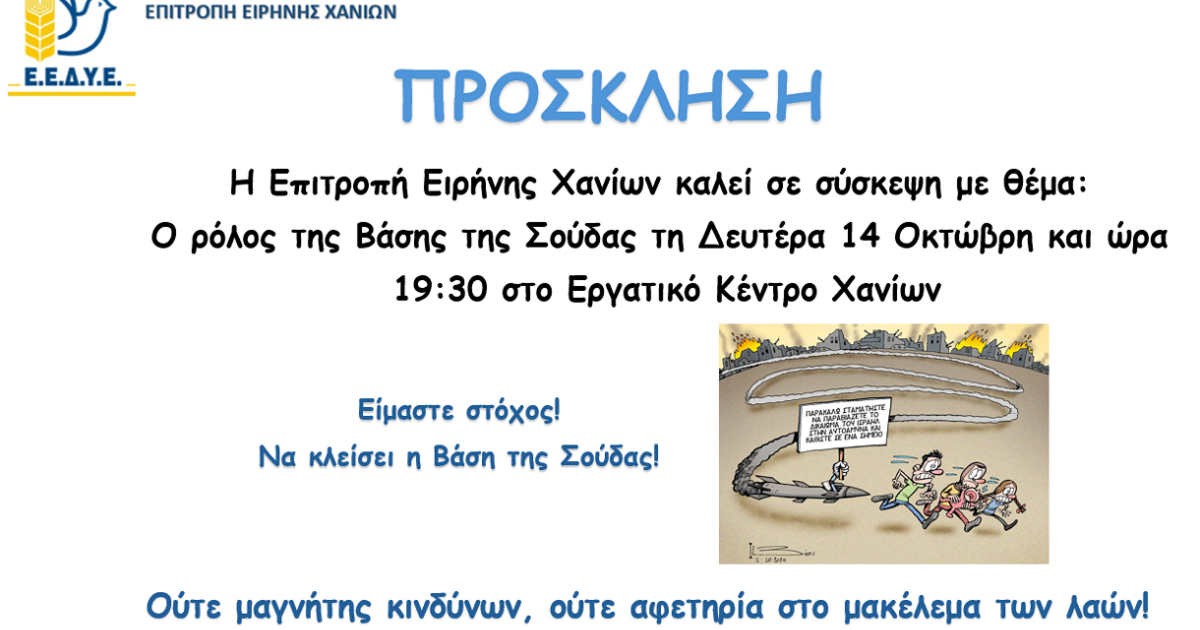 • Δευτέρα 14 Οκτώβρη στις 19:30, σύσκεψη μαζικών φορέων στο Εργατικό Κέντρο Χανίων με θέμα: «Ο ρόλος της Βάσης της Σούδας»