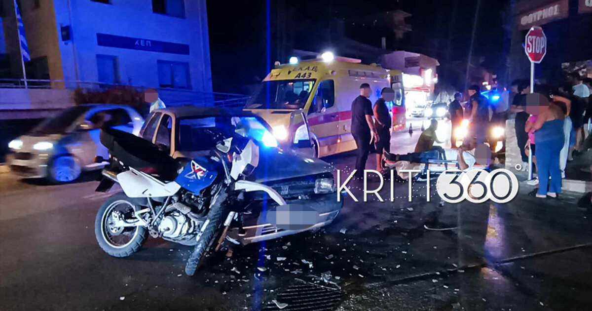 Σύμφωνα με το kriti360, αυτοκίνητο και μηχανάκι συγκρούστηκαν, με αποτέλεσμα να τραυματιστούν ένας άνδρας και μια γυναίκα, οι οποίοι επέβαιναν στο δίκυκλο.