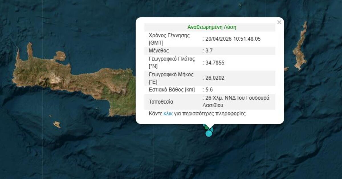 Αναλυτικότερα, ο σεισμός σημειώθηκε λίγα λεπτά πριν από τις 2 το μεσημέρι (13:51) με επίκεντρο 26χλμ ΝΝΔ του Γουδουρά Λασιθίου και εστιακό βάθος στα 5,6 χλμ.