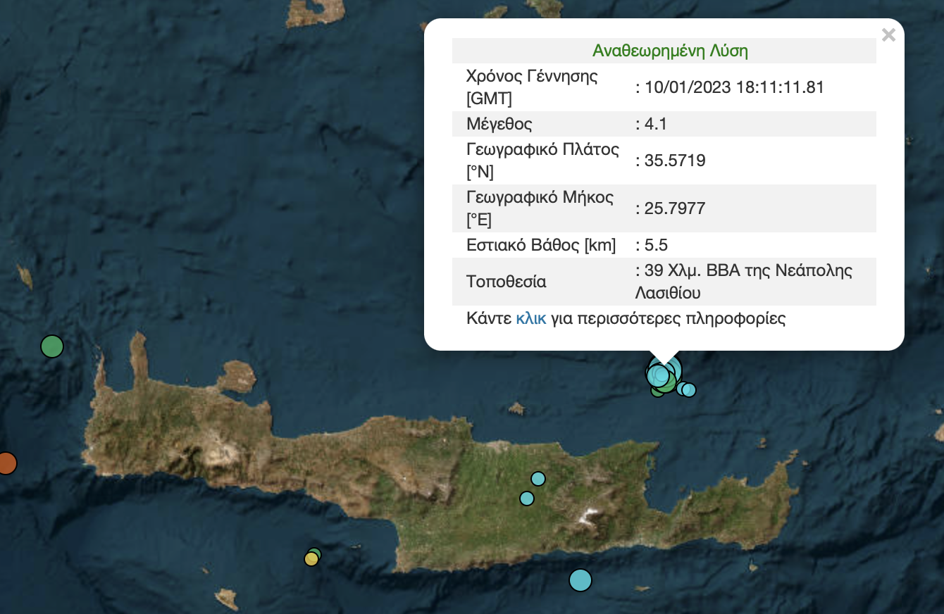Σεισμός 4.1 Ρίχτερ σημειώθηκε νωρίς το βράδυ της Τρίτης, με το επίκεντρο να βρίσκεται ξανά βόρεια της Νεάπολης Λασιθίου.