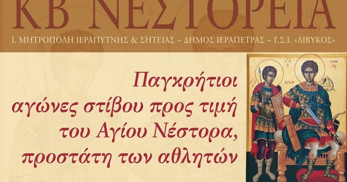 Η Ιερά Μητρόπολη Ιεραπύτνης και Σητείας σε συνεργασία με τον Δήμο Ιεράπετρας και το Γυμναστικό Σύλλογο «ΛΙΒΥΚΟΣ» διοργανώνουν και φέτος αγώνες στίβου, τα «ΚΒ΄ ΝΕΣΤΟΡΕΙΑ», προς τιμήν του Αγίου Μάρτυρος Νέστορος, προστάτου των αθλητών.