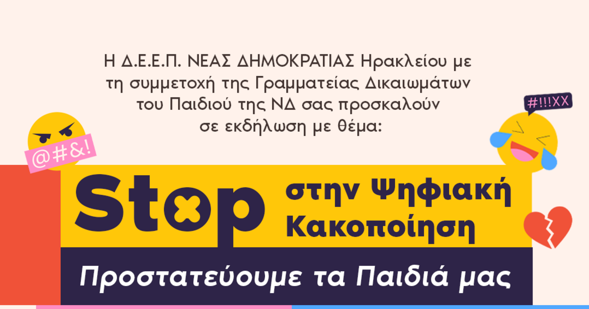 «Η Δ.Ε.Ε.Π. ΝΕΑΣ ΔΗΜΟΚΡΑΤΙΑΣ Ηρακλείου με τη συμμετοχή της Γραμματείας Δικαιωμάτων του Παιδιού της ΝΔ σας προσκαλούν σε εκδήλωση με θέμα «Stop στην Ψηφιακή Κακοποίηση – Προστατεύουμε τα Παιδιά μας».