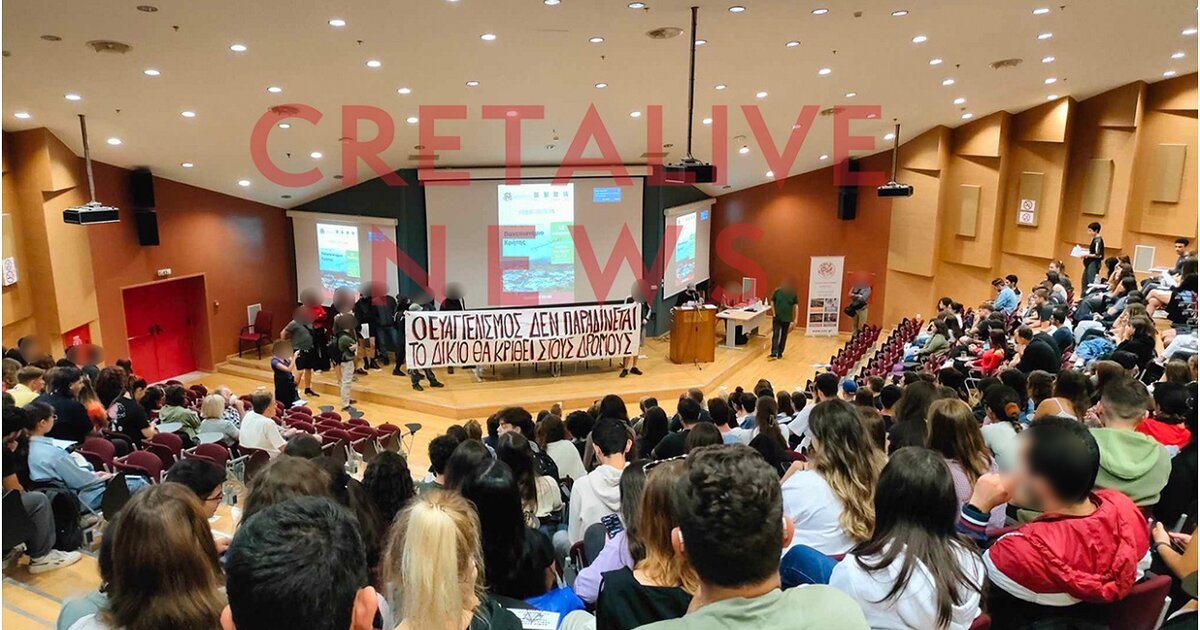 Νωρίτερα σήμερα, παρέμβαση στο αμφιθέατρο "Πετρίδης" του Μαθηματικού Τμήματος στις Βούτες στο Ηράκλειο, έκανε ομάδα νεαρών ατόμων κατά την τελετή υποδοχής των πρωτοετών φοιτητών με πανό όπου ανέγραφαν συνθήματα για το θέμα της εκκένωσης.