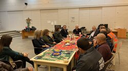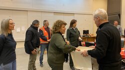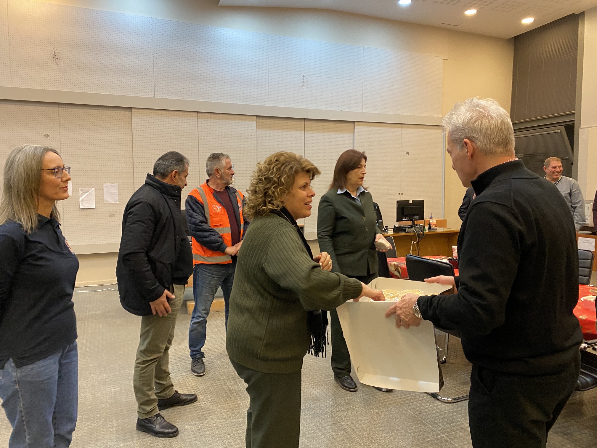 Ο Δήμαρχος Ηρακλείου συνομίλησε και αντάλλαξε ευχές με τους εργαζόμενους, δέχθηκε ως δώρο ένα καπέλο της Υπηρεσίας Πολιτικής Προστασίας, επεσήμανε το πόσο σημαντική είναι η αποστολή τους για τους πολίτες αλλά και τους επισκέπτες του Δήμου, στο οποίο δίνει πολύ μεγάλη σημασία, όπως φυσικά και στους ανθρώπους των Υπηρεσιών που το επιτελούν. Τόνισε επίσης την ανάγκη εκπόνησης ενός πλήρους σχεδίου πολιτικής προστασίας, τη σπουδαιότητα των συνεργιών με συναρμόδιους Φορείς, καταλήγοντας: «Με τη συνεργασία μας τα επόμενα χρόνια θα μπορέσουνε να έχουμε καλύτερα αποτελέσματα. Γνωρίζουμε τα προβλήματα, γνωρίζουμε ότι το προσωπικό και τα μέσα δεν επαρκούν και στόχος μας είναι να καταφέρουμε προοδευτικά να τα καλύψουμε.».