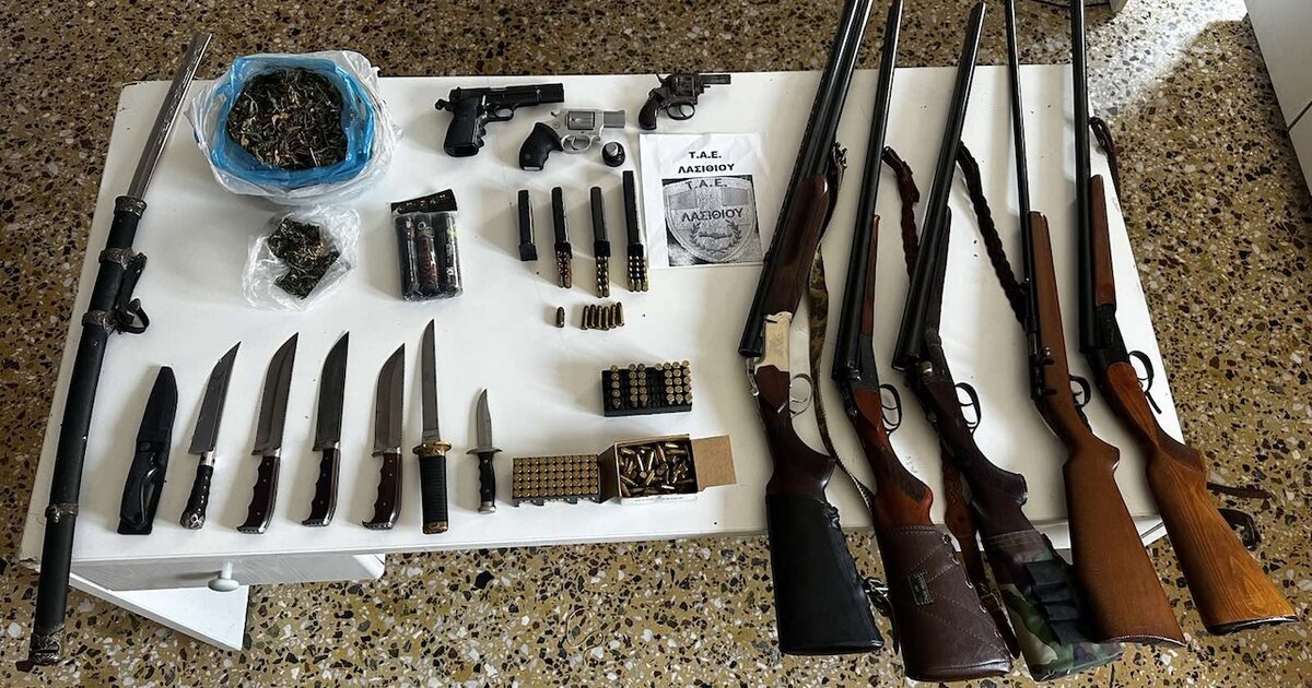 Ένα μικρό οπλοστάσιο είχε στην κατοχή του ένας 61χρονος ο οποίος συνελήφθη το πρωί της Παρασκευής στη διάρκεια αστυνομικής επιχείρησης σε περιοχή του Δήμου Αγίου Νικολάου στο Λασίθι. Ο συλληφθείς που κατηγορείται για παραβάσεις της νομοθεσίας περί όπλων αλλά και περί ναρκωτικών, είχε μια "συλλογή" από 8 όπλα, γεμιστήρες, φυσίγγια, μαχαίρια και κροτίδες. Οι αστυνομικοί βρήκαν ακόμη ένα ξίφος αλλά και περισσότερα από 120 γραμμάρια κάνναβης.